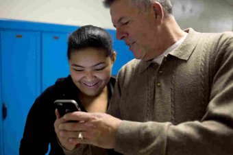 - John Vowell (right) shows Tiasa Cantrell, 13, photos on his phone. Cantrell comes to Major Chords for Minors to hang out with John and Katrina while her twin sister takes guitar lessons.