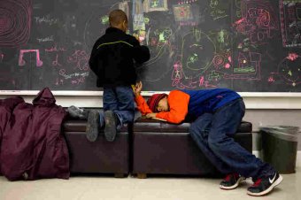 - Nikia Cliff II, 6, colors on the chalkboard inside the Major Chords for Minors office before his piano lesson, while his older brother Khalil Cliff, 10, takes a nap before his drum lesson.