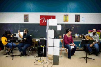 - Tanzania Cantrell (from left), 13, and her guitar teacher, Ryan Fitzgerald, talk about wrist cramps while Katrina Vowell talks to guitar instructor Mike Tesch before one of his lessons begins.